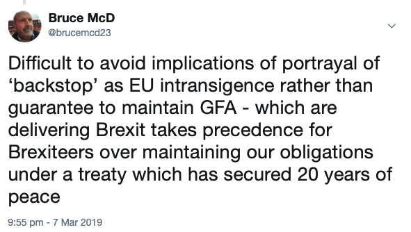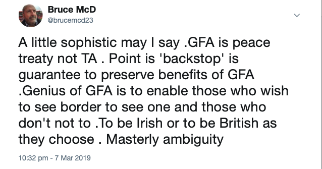 As far as I recall the exchange was sparked off by my proclaiming that the ‘Backstop’ should have been from the outset called the Good Friday Guarantee . Calling it Backstop made it liable to be portrayed as a bureaucratic impost . Whereas it should be seen for what it was – a principled and high minded measure to preserve the benefits of the Good Friday Agreement . Furthermore Brexiteers by not regarding it as such were wilfully playing fast and loose with all the hard won benefits that peace had brought .