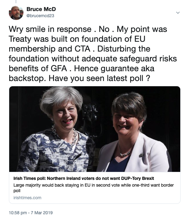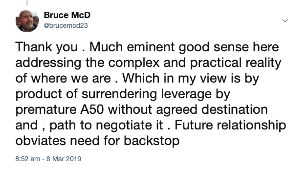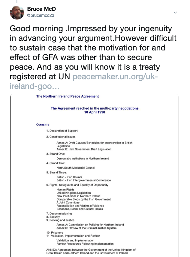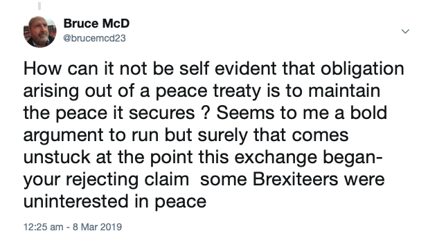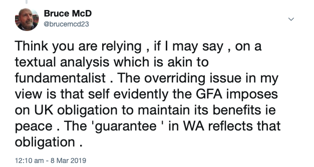 That is where our exchange ended . Without agreement on anything much other than HMG should not have started from where it did . However the stridency of Daniel’s view that the GFA was being elevated to an entirely unwarranted degree as a means to block Brexit surprised me . His two central points – Border never mentioned in , and challenge to status of GFA , have cropped up frequently in other exchanges with Brexiteers . Although in those cases argued considerably less coherently and often expressed with all the understanding of Nadine Dorries repeating a WhatsApp message from Steve Baker
